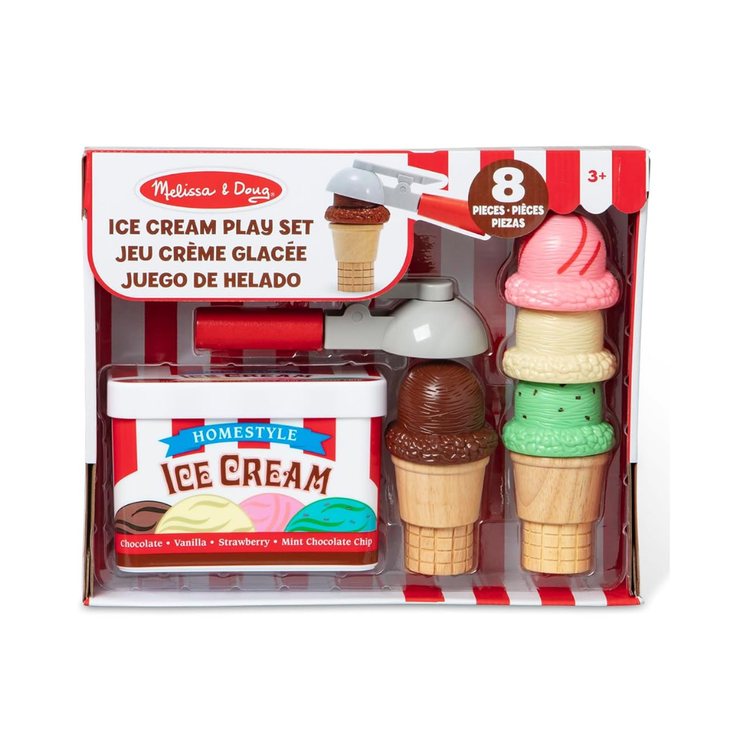 Serve up cool treats with the Melissa & Doug Scoop & Stack Ice Cream Cone Play Set. Kids will love serving pretend desserts with a “click” for satisfying sensory play. The magnetic scooper lifts and stacks four favorite flavors—vanilla, chocolate, strawberry, and mint chip—onto wooden cones, then releases with a press of the lever. Everything stores neatly in a sturdy ice cream tub for easy cleanup. With plenty of opportunities for sharing, storytelling, and skill-building, this set serves up endless imaginative fun for kids ages 3 and older.